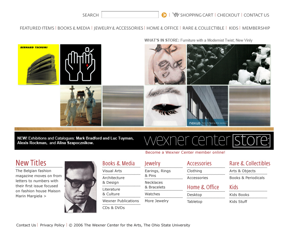 COLUMBUS—When architect Peter Eiseneman broke the rules with his Deconstructivist masterpiece, the Wexner Center for the Arts quickly made a name for itself as a cutting-edge contemporary arts center and as one of the country’s best places to shop for arts-related media and products. The Wexner Center Store stocks thousands of rare and hard-to-find titles, on topics ranging from film and video to painting, the performing arts, architecture, photography, and theory and criticism.