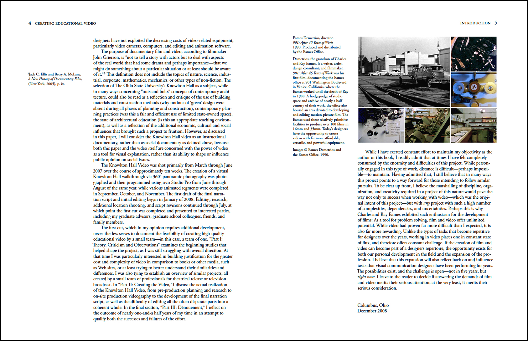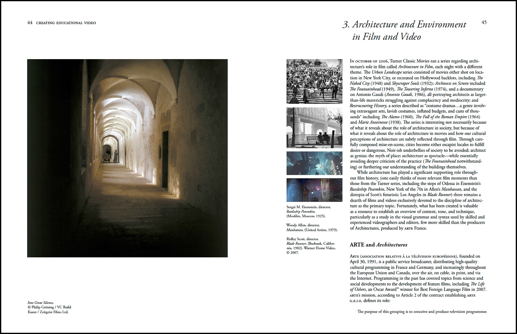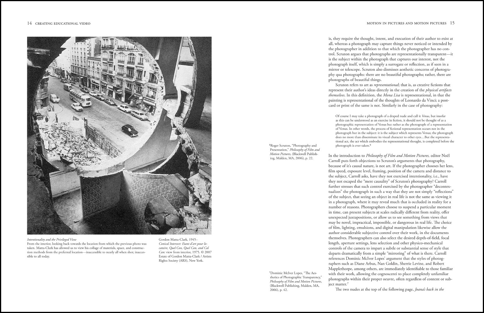 Creating Educational Video: Theory and Practice for Visual Communication Designers was initially conceived as a detailed technical journal chronicling the creation of the documentary/educational video Form/Space/Program: Knowlton Hall. It became a longer meditation on architecture, photography, and the philosophy of motion pictures, in general, and a pedagogical tool, pointing to a way forward for designers committed to expanding the scope of their profession.