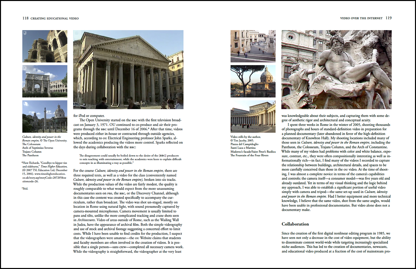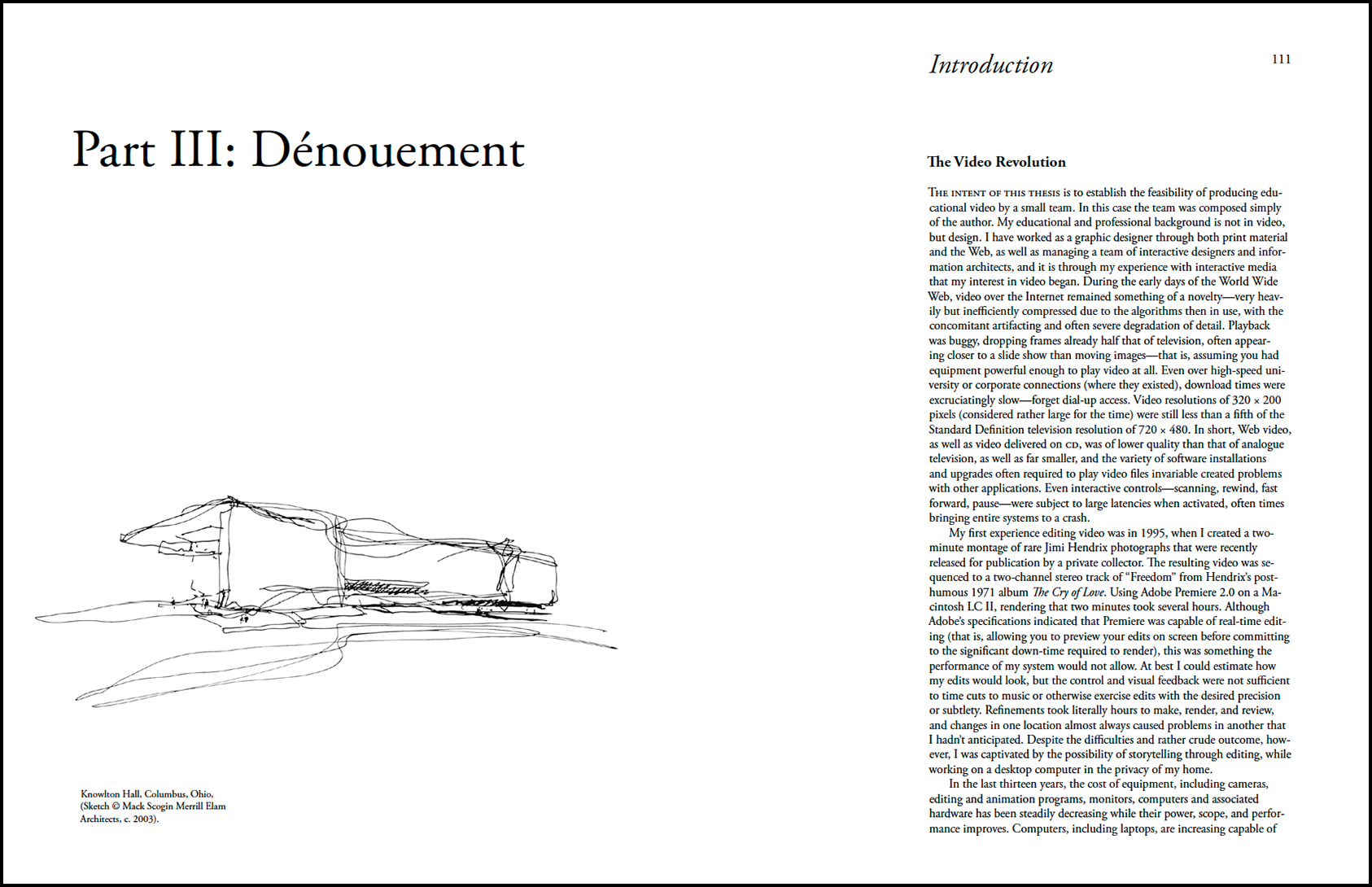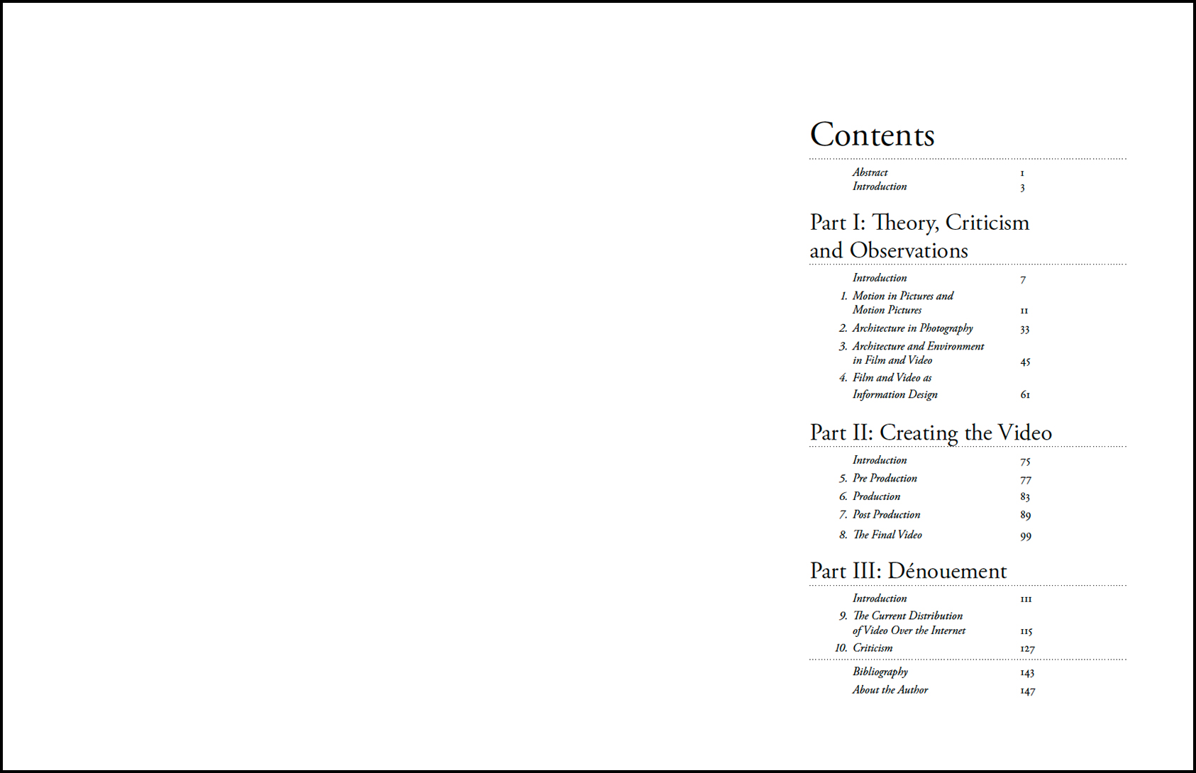 Creating Educational Video: Theory and Practice for Visual Communication Designers was initially conceived as a detailed technical journal chronicling the creation of the documentary/educational video Form/Space/Program: Knowlton Hall. It became a longer meditation on architecture, photography, and the philosophy of motion pictures, in general, and a pedagogical tool, pointing to a way forward for designers committed to expanding the scope of their profession.